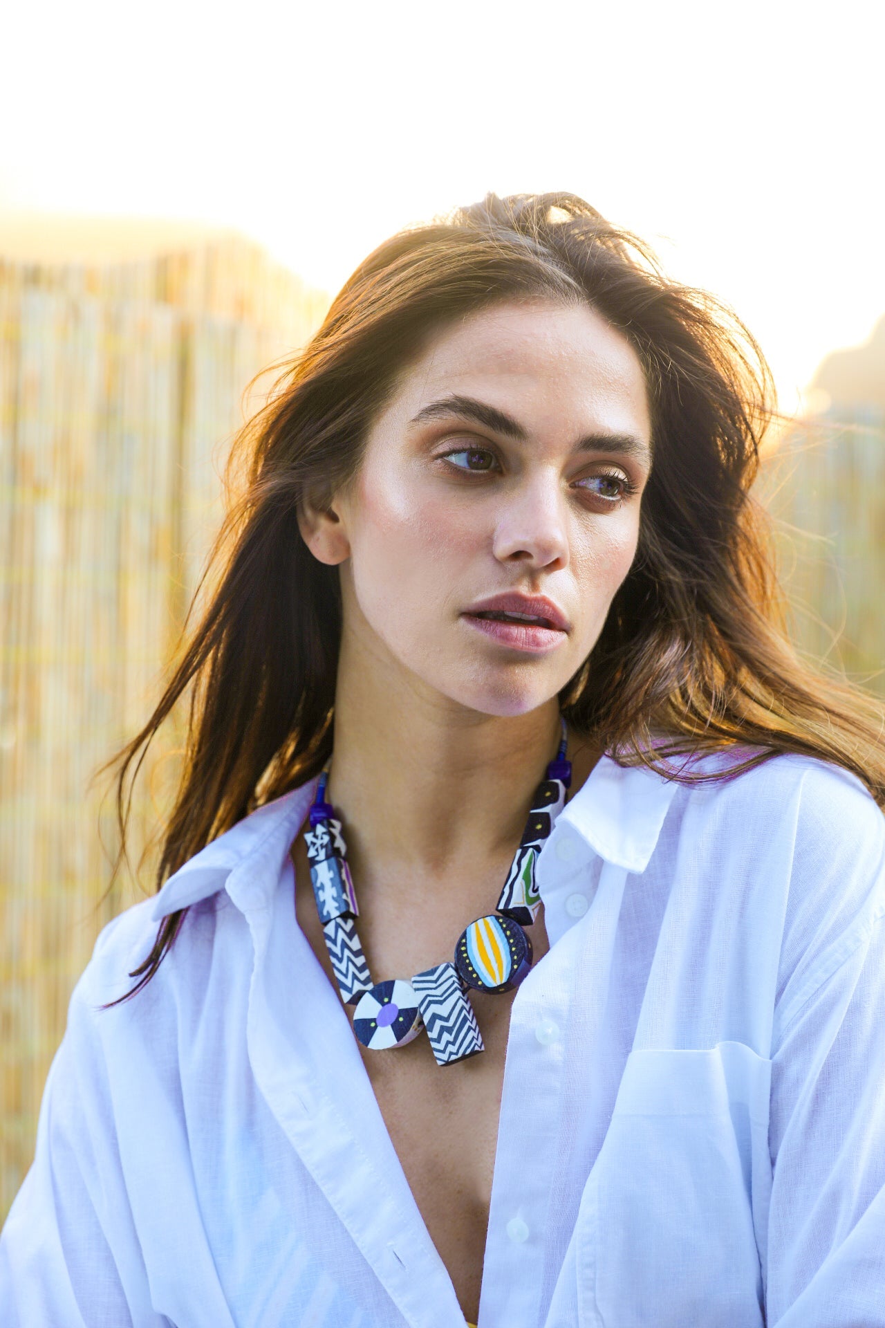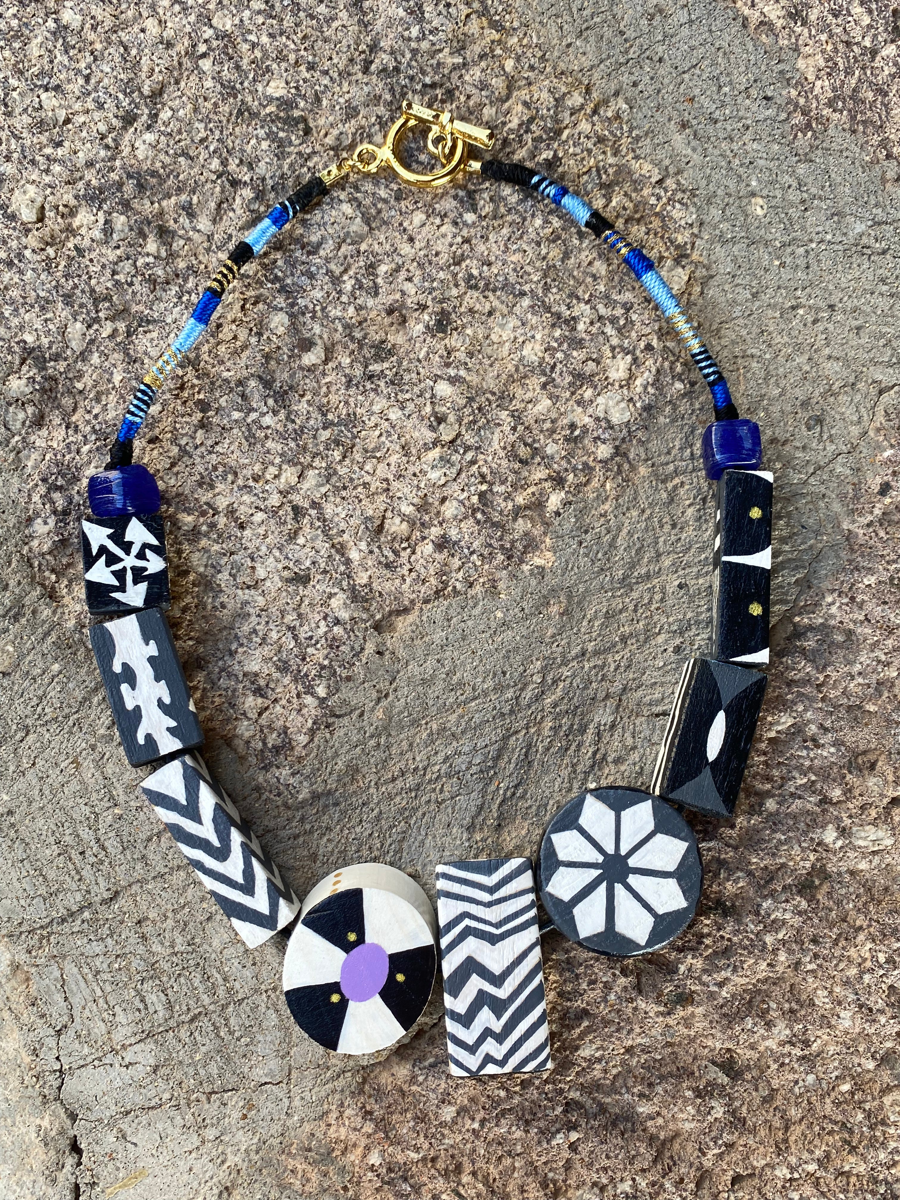 Each wooden piece, individually cut and shaped, is accompanied by natural glass beads and painted by hand with patterns that complement our collection. Different patterns can be found on both sides of the wooden pieces, allowing you to easily create your own necklace by flipping them. The necklace string is made of genuine leather wrapped with threads matching the pattern colors. The necklace closure is gold plated brass.