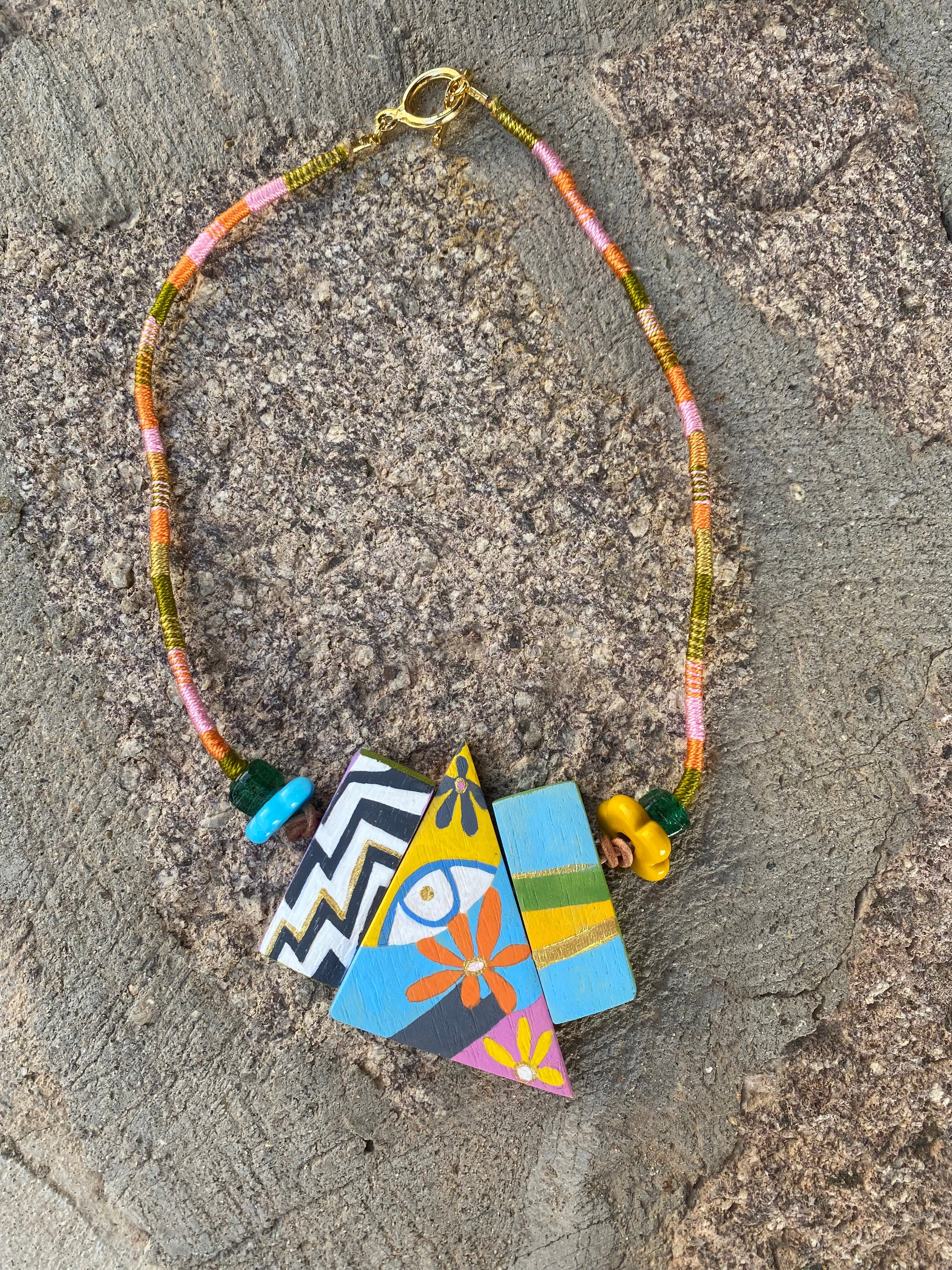 Each wooden piece, individually cut and shaped, is accompanied by natural glass beads and painted by hand with patterns that complement our collection. Different patterns can be found on both sides of the wooden pieces, allowing you to easily create your own necklace by flipping them. The necklace string is made of genuine leather wrapped with threads matching the pattern colors. The necklace closure is gold plated brass.