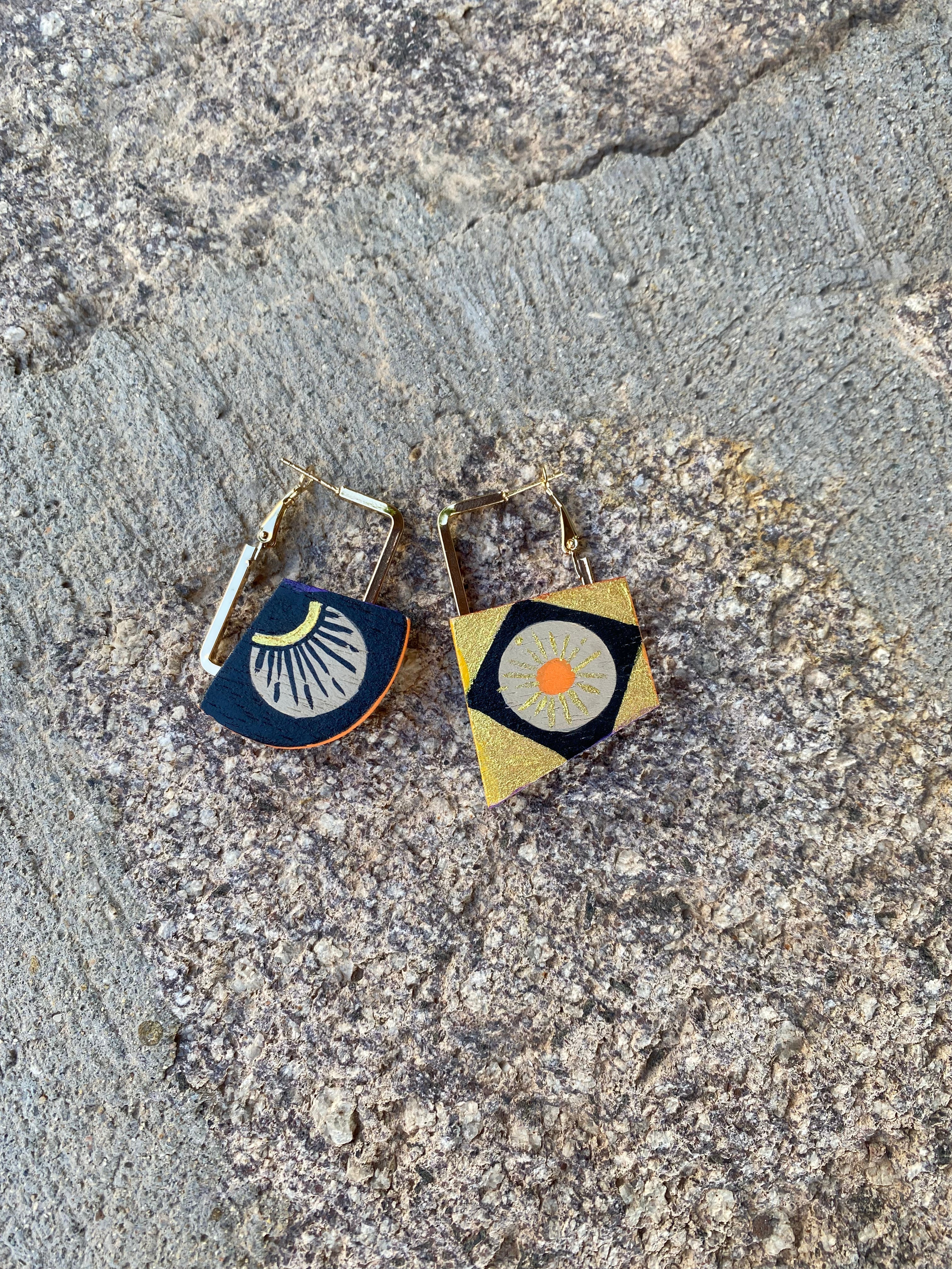 Each wooden piece, individually cut and shaped and painted by hand with patterns that complement our collection. Different patterns and colors can be found on both sides of the wooden pieces.