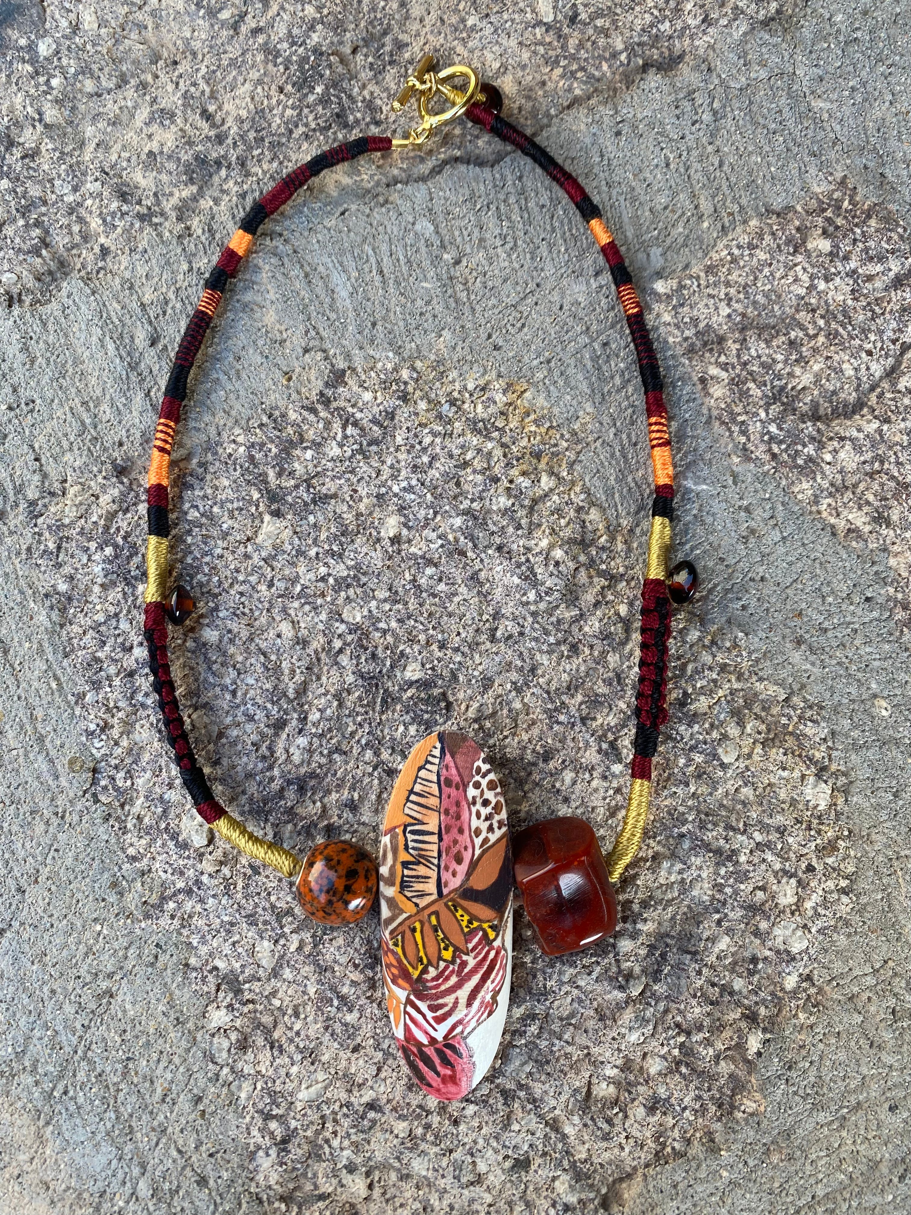 Each wooden piece, individually cut and shaped, is accompanied by natural glass beads and painted by hand with patterns that complement our collection. Different patterns can be found on both sides of the wooden pieces, allowing you to easily create your own necklace by flipping them. The necklace string is made of genuine leather wrapped with threads matching the pattern colors. The necklace closure is gold plated brass.