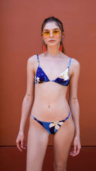 Tropical garden in the most beautiful blue tones. Slim triangle bikini top with gold tone round shaped hardware on the front. Fully adjustable top with self-tie fastenings and adjustable shoulder straps featuring gold tone hardware. Removable breast cups.