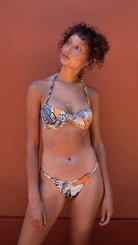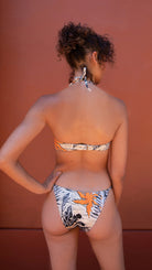 Vintage palm beach vibes for sunny days. Twist bandeau top adjustable hook back closure with luxe gold tone hardware. Removable self-tie halter strap and removable breast cups.