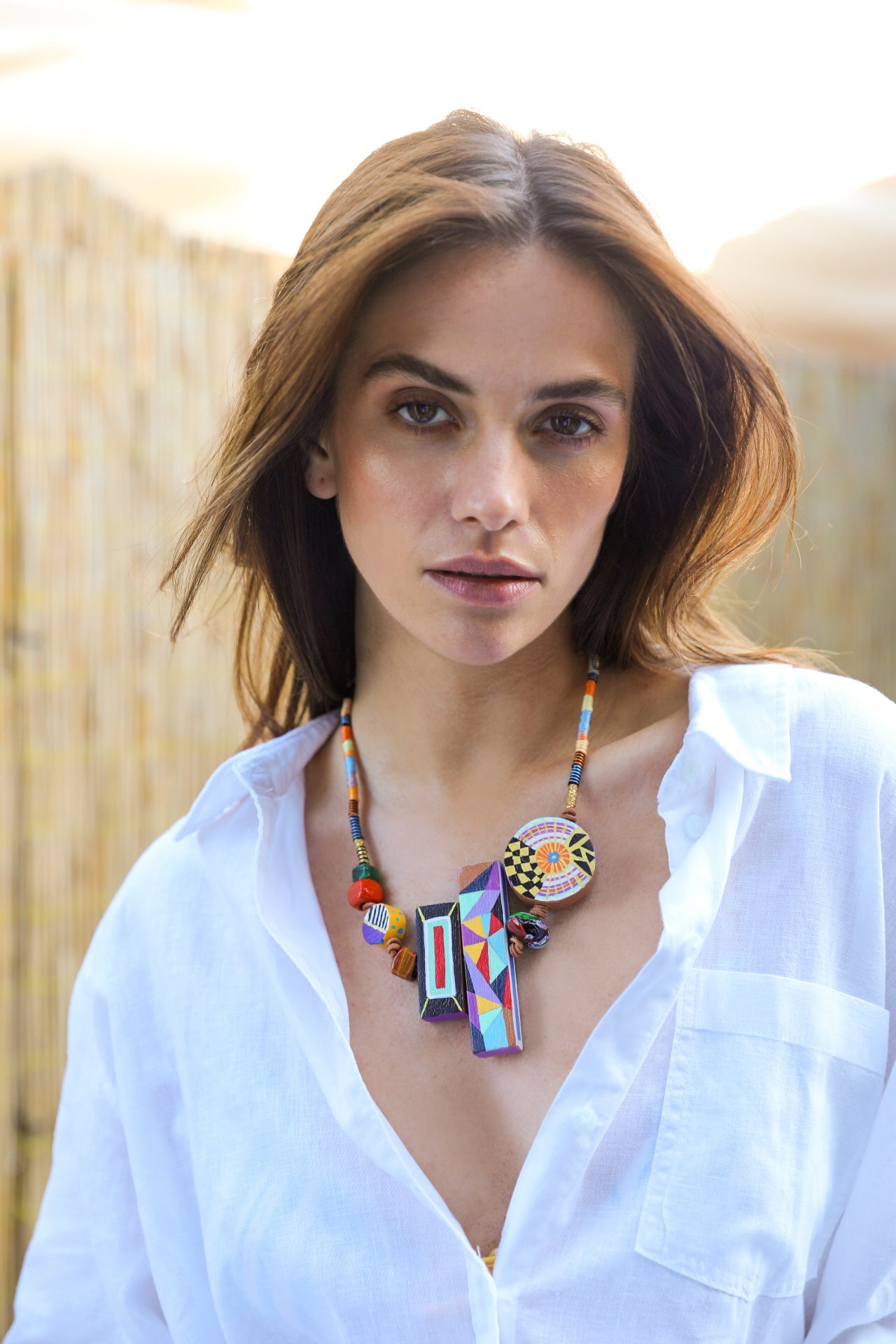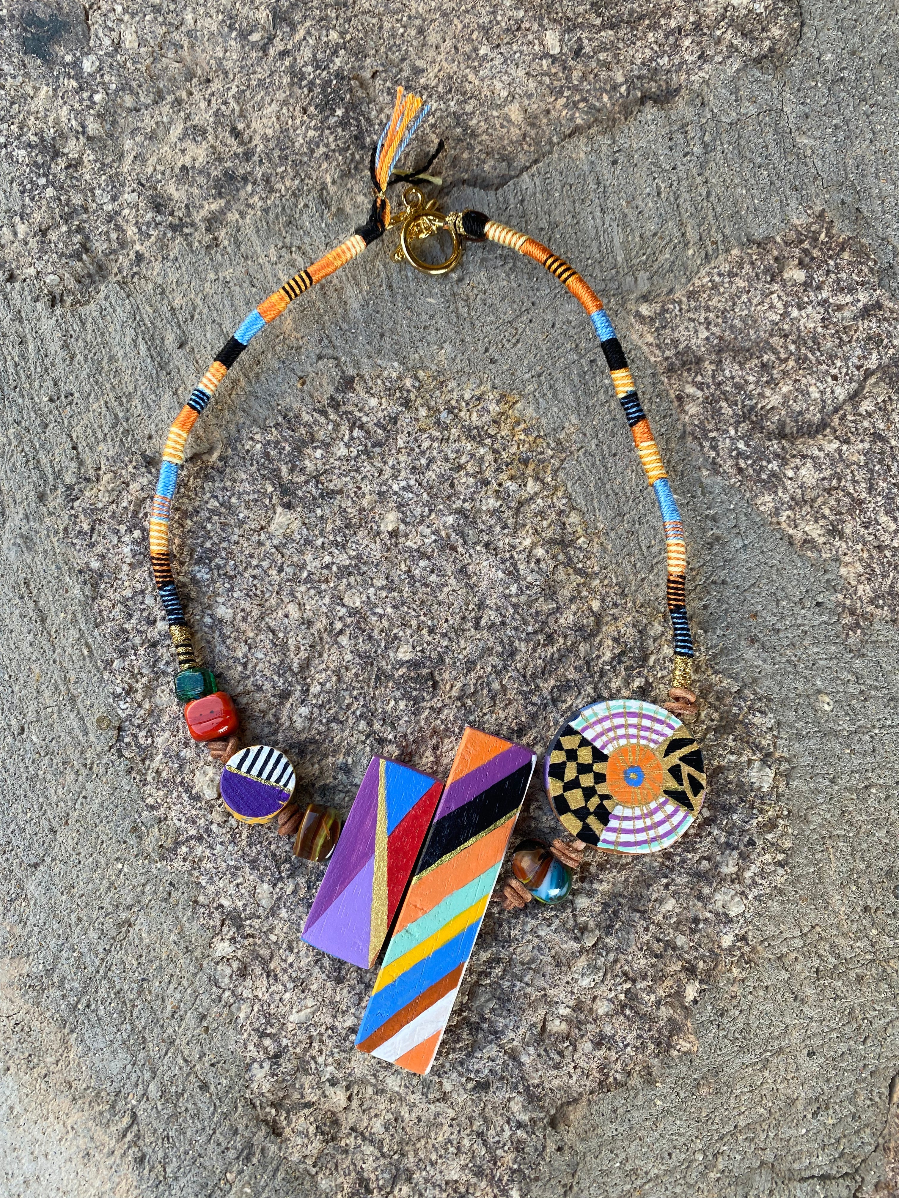 Each wooden piece, individually cut and shaped, is accompanied by natural glass beads and painted by hand with patterns that complement our collection. Different patterns can be found on both sides of the wooden pieces, allowing you to easily create your own necklace by flipping them. The necklace string is made of genuine leather wrapped with threads matching the pattern colors. The necklace closure is gold plated brass.